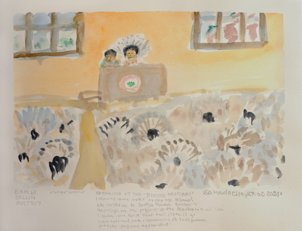 SPEAKING AT THE "BERGER HEARINGS" I showed some notes to George Manuel who invited me to Justice Thomas Berger's Hearings on the project of the Mackenzie oil line. I spoke, and said that this issue is an International one, concerning all Indigenous people, and was applauded.