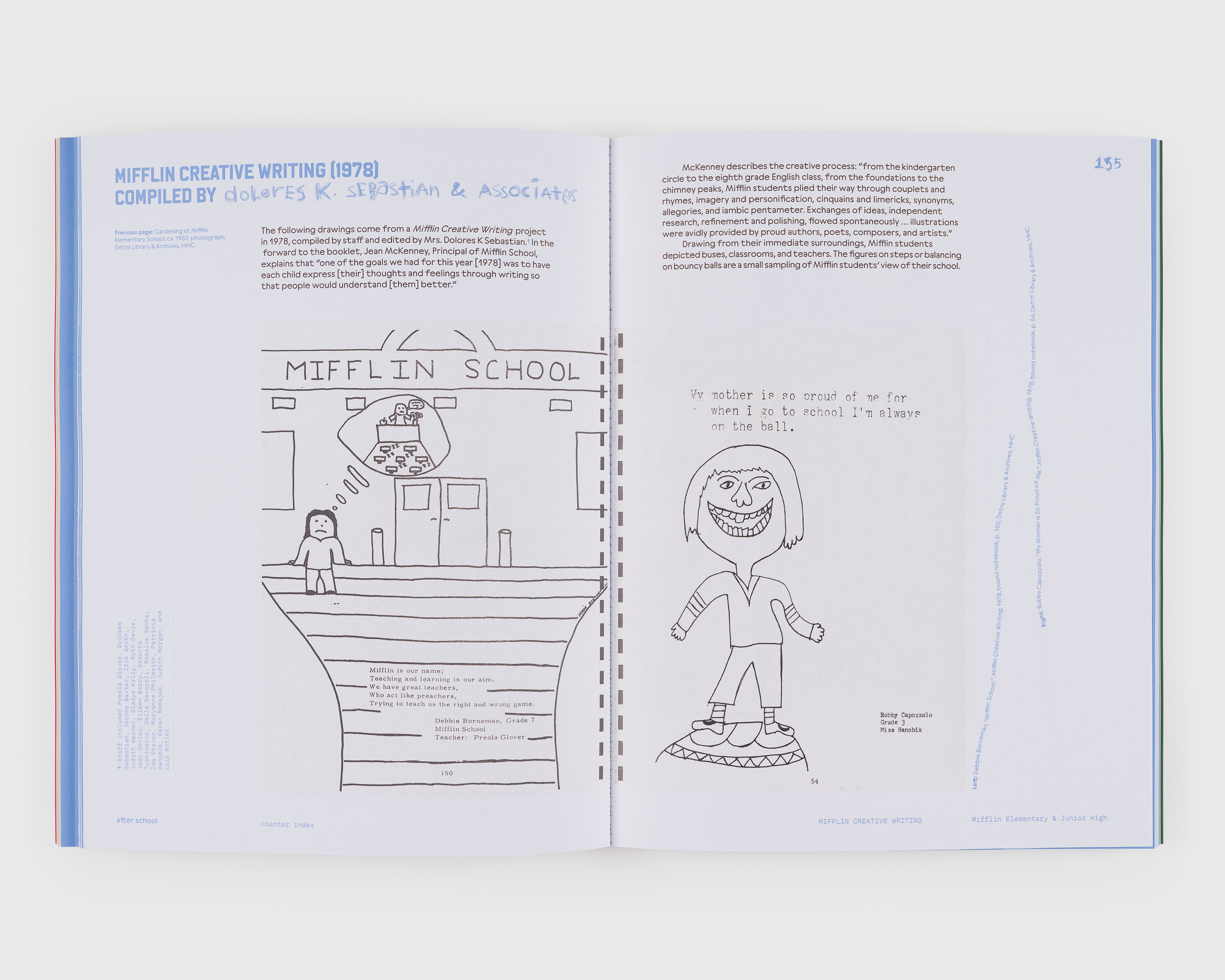 Essays, testimonies, lesson plans, and archival materials trace histories from the city’s first public high school and New Deal–era programs to cooperative school gardens and Black-led Street Academies of the 1970s. Drawings and photographs accompany the texts, attentive to how education takes form in buildings, streets, policies, and everyday life. after school gestures toward the possibility of a school not yet here.